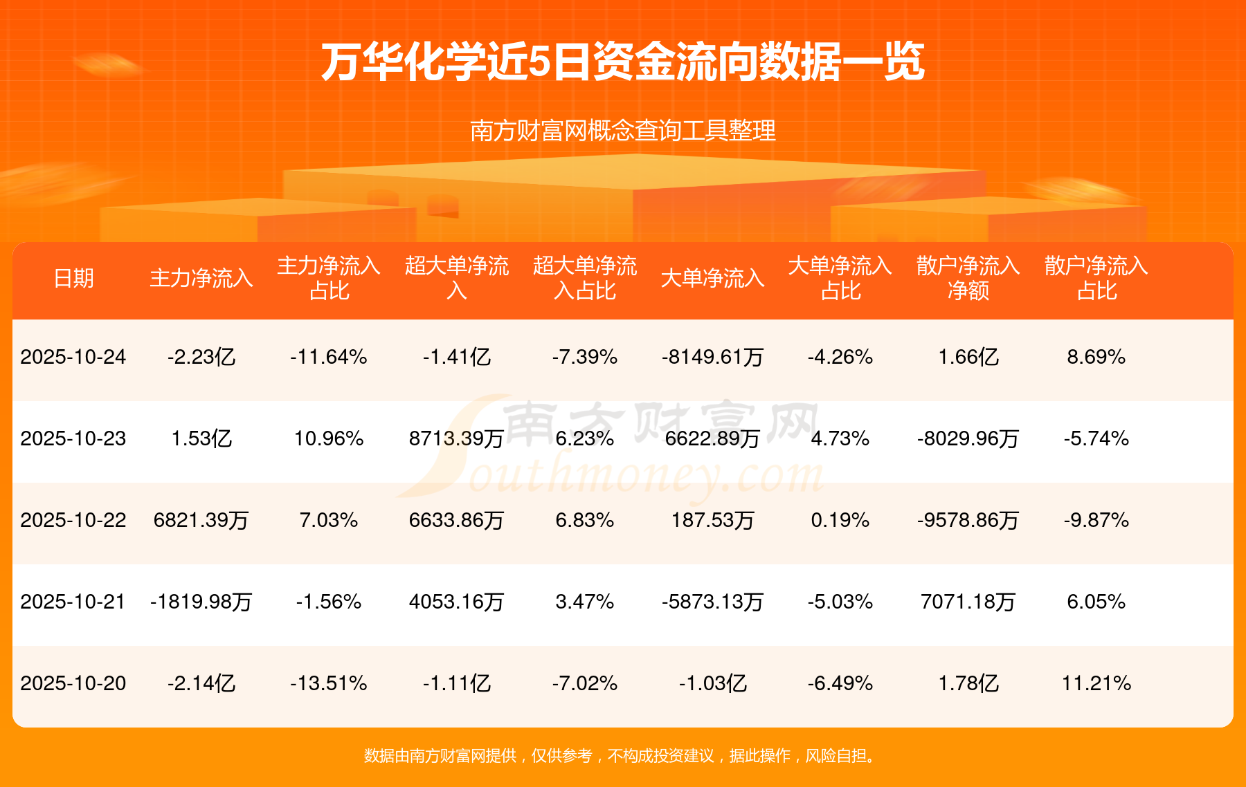 10月24日消息,萬(wàn)華化學(xué)10月24日主力凈流出2.23億元,超大單凈流出1.41億元,大單凈流出8149.61萬(wàn)元,散戶凈流入1.66億元。