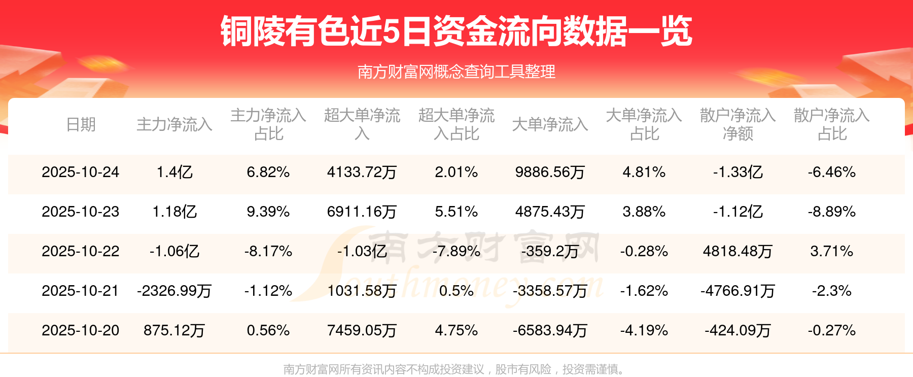 10月24日消息,銅陵有色10月24日主力凈流入1.4億元,超大單凈流入4133.72萬元,大單凈流入9886.56萬元,散戶凈流出1.33億元。