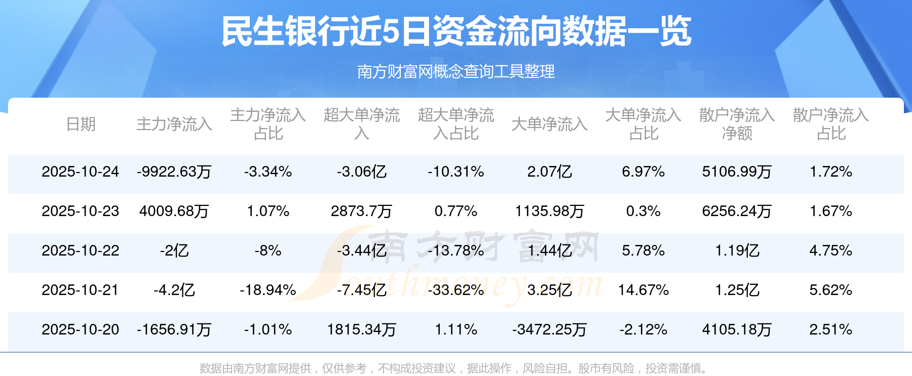 10月24日消息,民生銀行主力資金凈流出9922.63萬元,超大單資金凈流出3.06億元,散戶資金凈流入5106.99萬元。