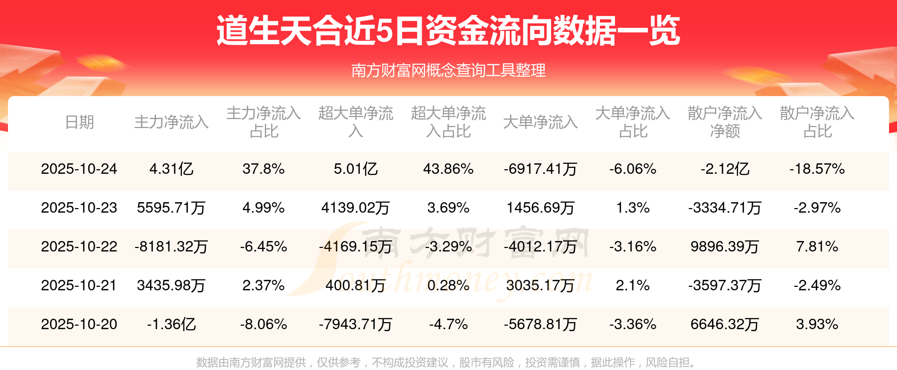 10月24日消息,道生天合主力資金凈流入4.31億元,超大單資金凈流入5.01億元,散戶資金凈流出2.12億元。
