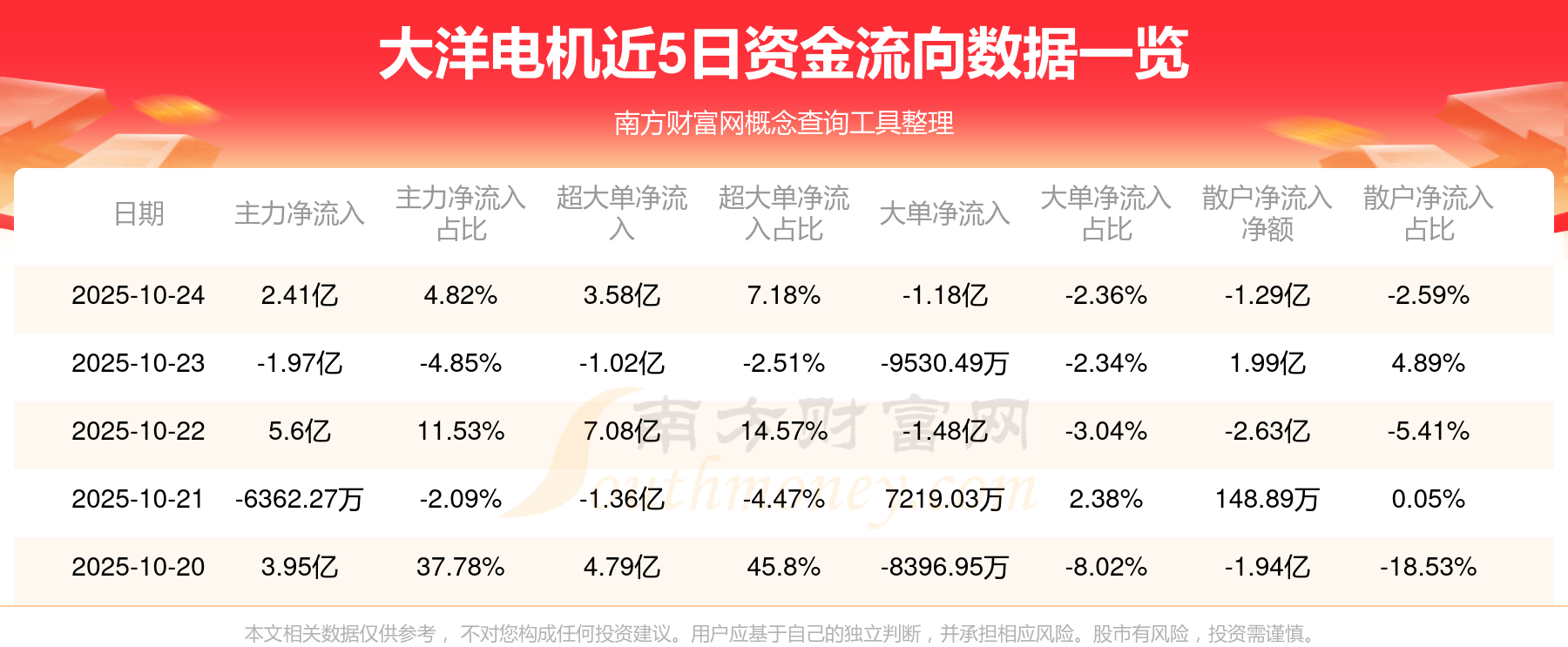 10月24日消息,大洋電機(jī)資金凈流入2.41億元,超大單資金凈流入3.58億元,換手率21.37%,成交金額49.91億元。
