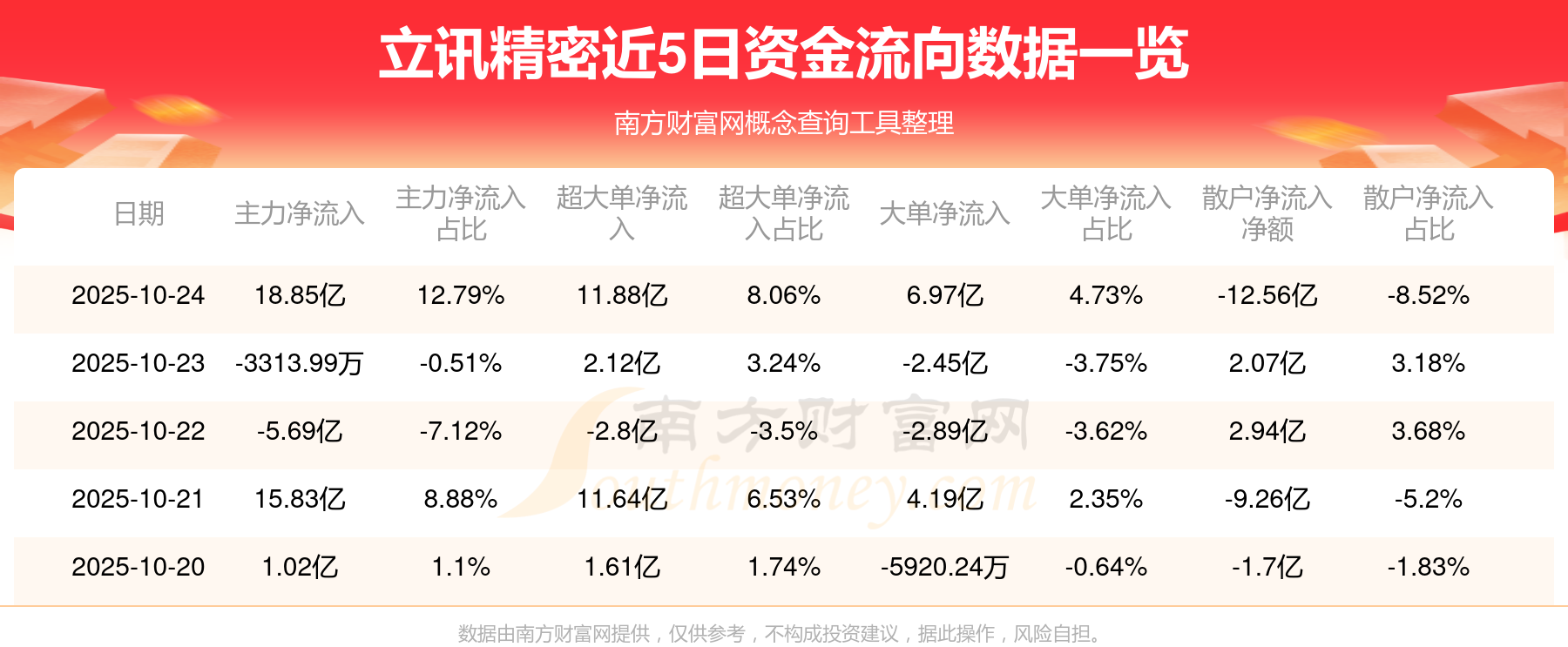 10月24日主力資金凈流入18.85億元,超大單資金凈流入11.88億元,換手率3.23%,成交金額147.37億元。