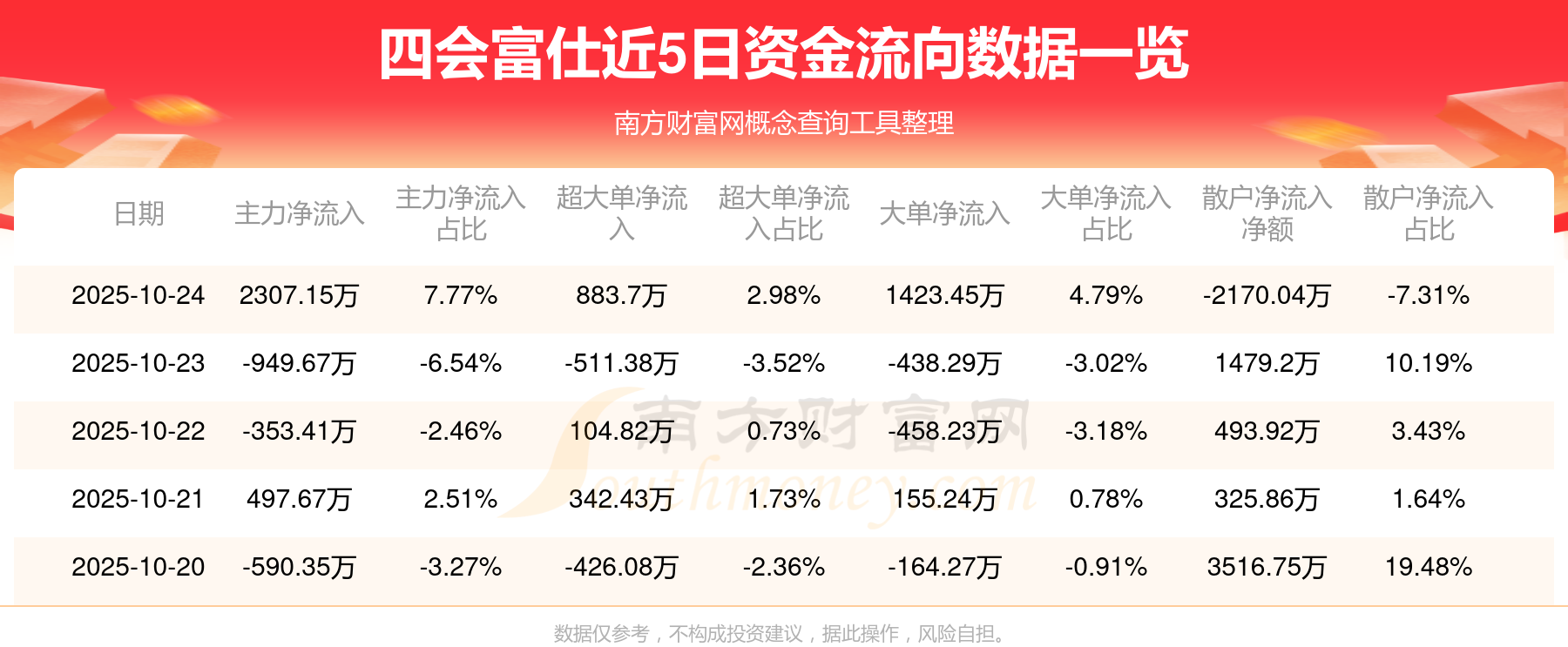 10月24日消息,四會(huì)富仕10月24日主力資金凈流入2307.15萬(wàn)元,超大單資金凈流入883.7萬(wàn)元,大單資金凈流入1423.45萬(wàn)元,散戶(hù)資金凈流出2170.04萬(wàn)元。