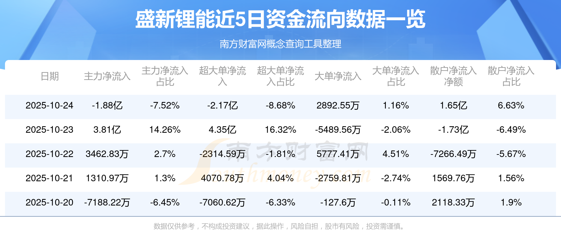 10月24日消息,盛新鋰能資金凈流出1.88億元,超大單資金凈流出2.17億元,換手率13.15%,成交金額24.94億元。