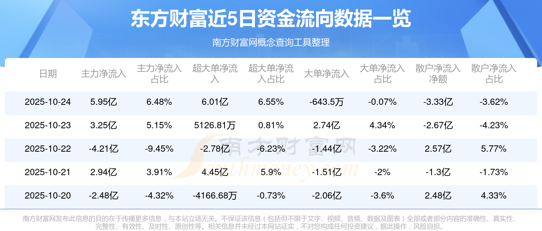 10月24日消息,東方財(cái)富主力資金凈流入5.95億元,超大單資金凈流入6.01億元,散戶資金凈流出3.33億元。