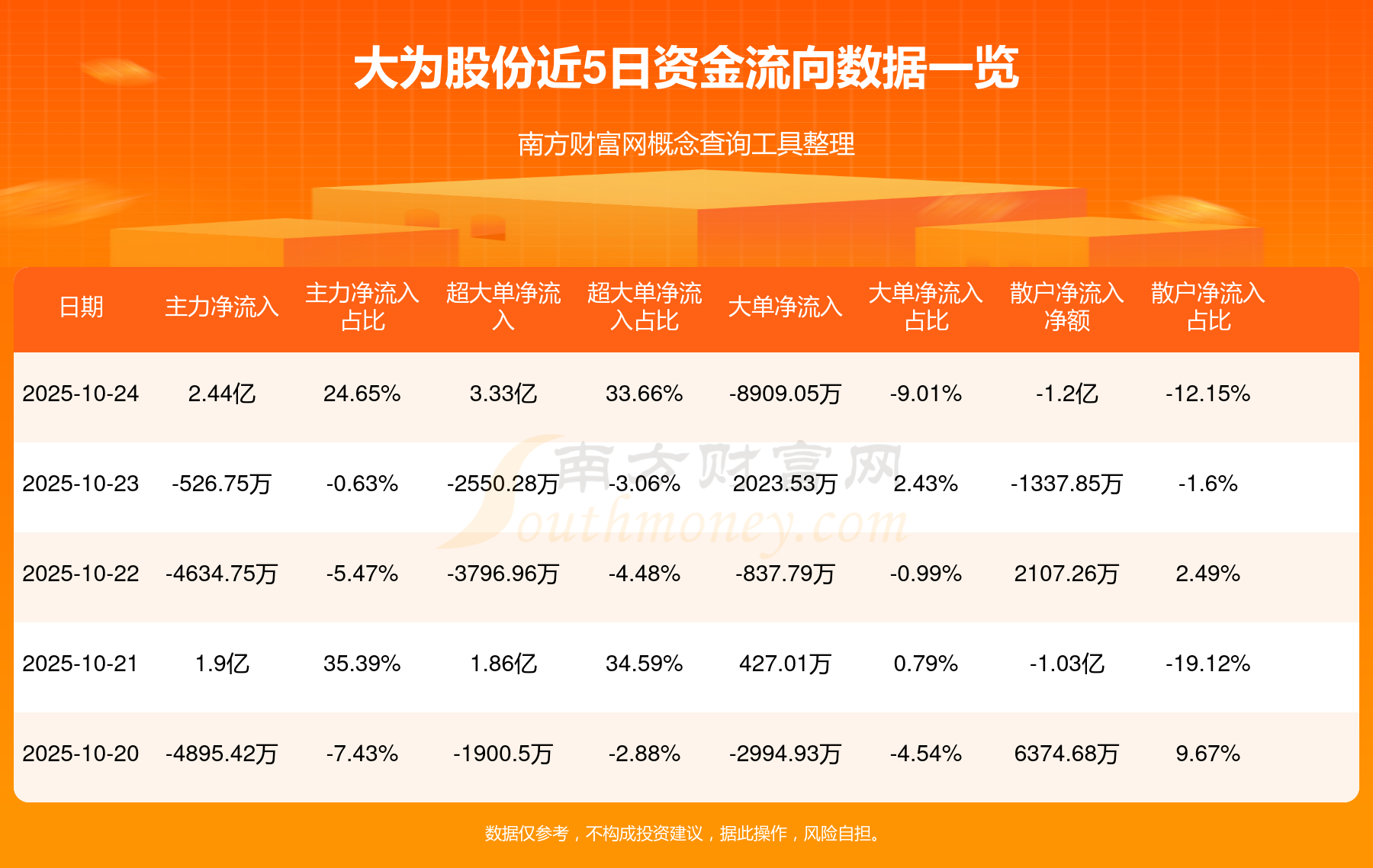 10月24日消息,大為股份資金凈流入2.44億元,超大單凈流入3.33億元,換手率21.24%,成交金額9.89億元。