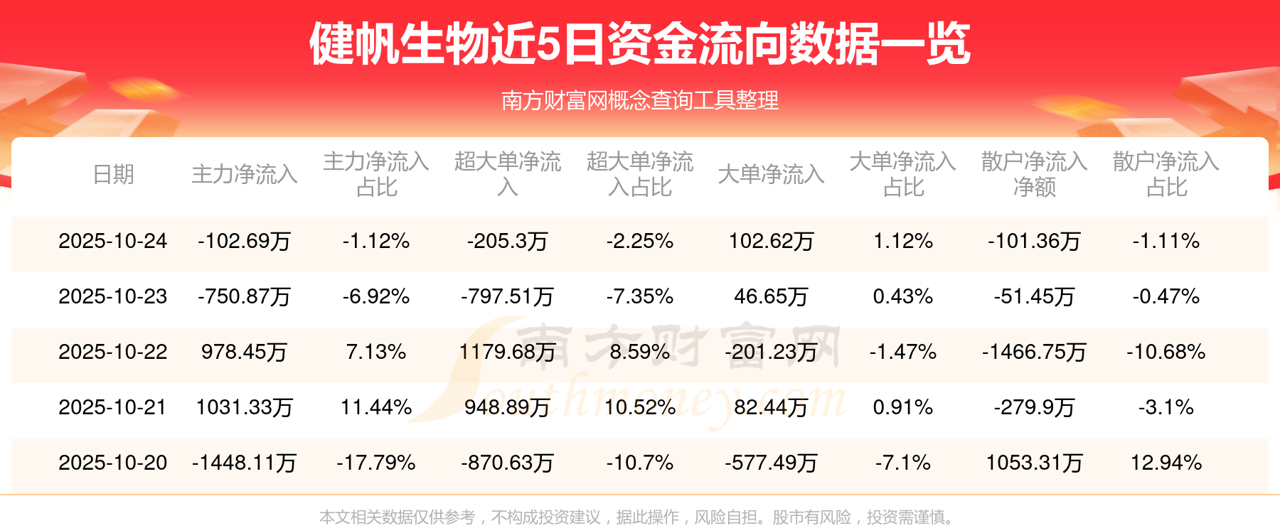 10月24日消息,健帆生物資金凈流出102.69萬元,超大單凈流出205.3萬元,換手率0.82%,成交金額9135.86萬元。