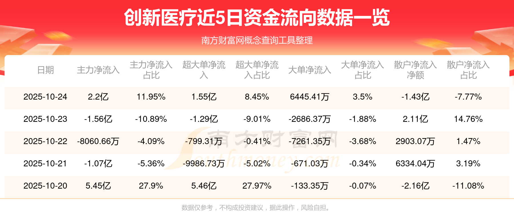 10月24日消息,創(chuàng)新醫(yī)療10月24日主力資金凈流入2.2億元,超大單資金凈流入1.55億元,大單資金凈流入6445.41萬元,散戶資金凈流出1.43億元。
