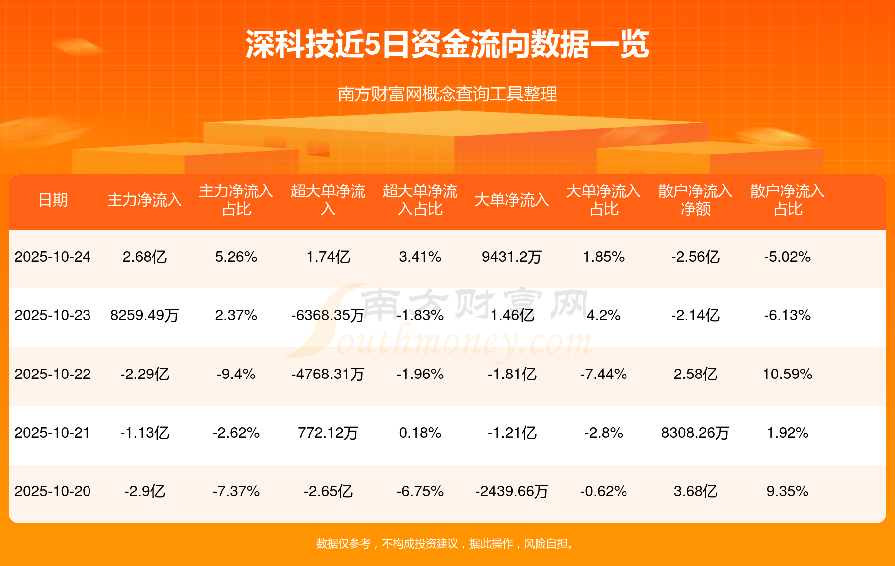 10月24日消息,深科技10月24日主力資金凈流入2.68億元,超大單資金凈流入1.74億元,大單資金凈流入9431.2萬元,散戶資金凈流出2.56億元。