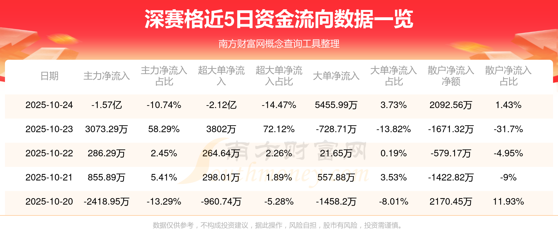 10月24日消息,深賽格資金凈流出1.57億元,超大單凈流出2.12億元,換手率13.25%,成交金額14.61億元。