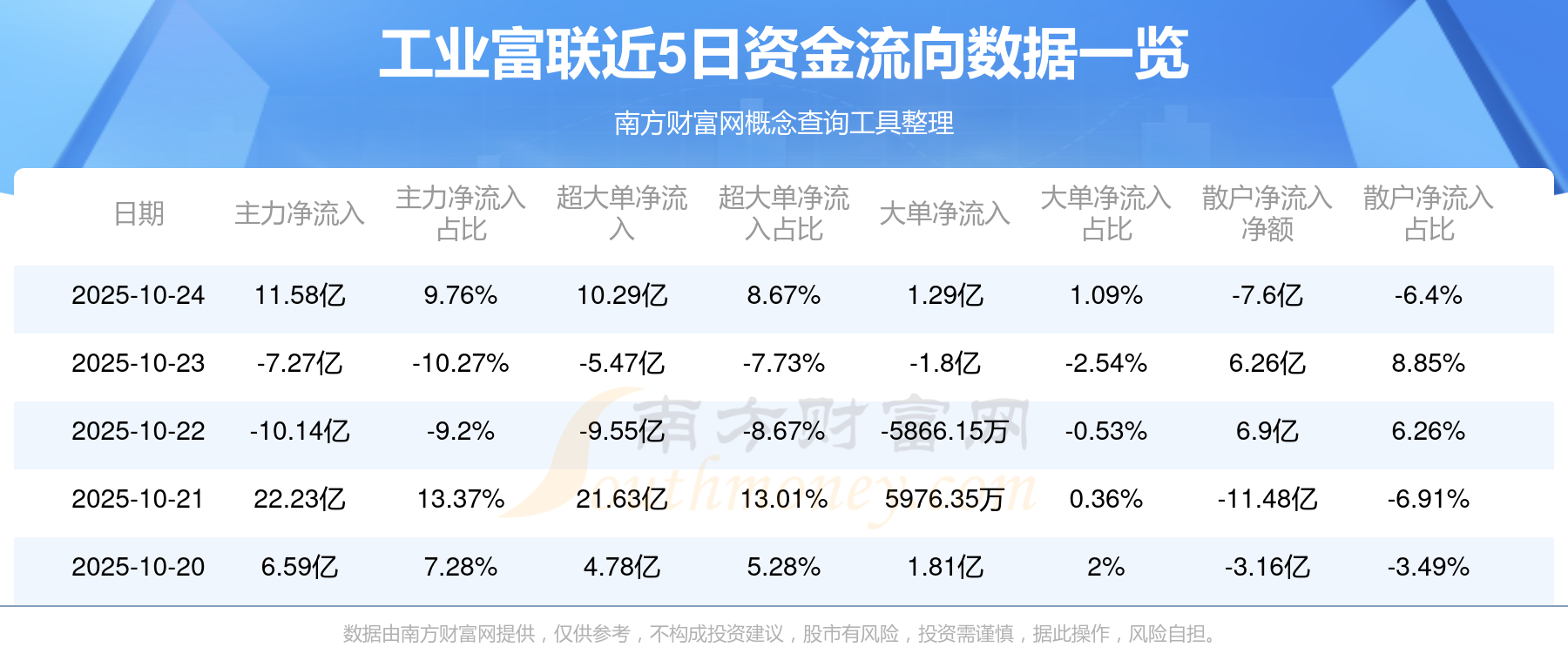 10月24日消息,工業(yè)富聯(lián)10月24日主力凈流入11.58億元,超大單凈流入10.29億元,大單凈流入1.29億元,散戶凈流出7.6億元。
