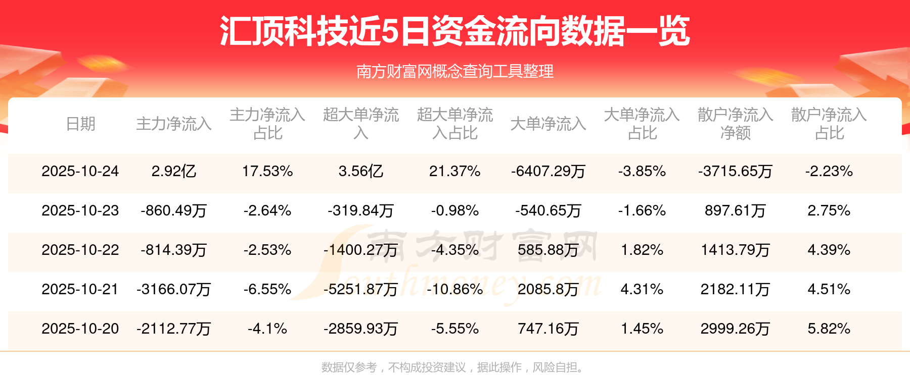 10月24日消息,匯頂科技10月24日主力凈流入2.92億元,超大單凈流入3.56億元,大單凈流出6407.29萬元,散戶凈流出3715.65萬元。