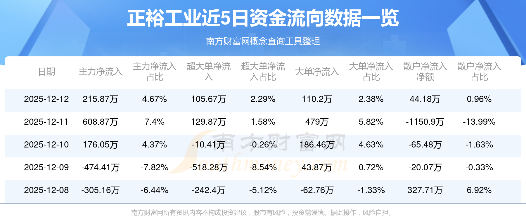 12月12日消息,正裕工業(yè)12月12日主力凈流入215.87萬元,超大單凈流入105.67萬元,大單凈流入110.2萬元,散戶凈流入44.18萬元。