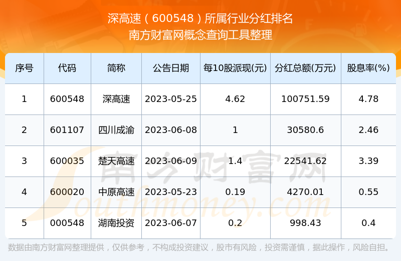 按照南方財富網(wǎng)趨勢選股系統(tǒng)統(tǒng)計,深高速所屬行業(yè)為鐵路公路行業(yè),鐵路公路行業(yè)分紅排名情況如下表: