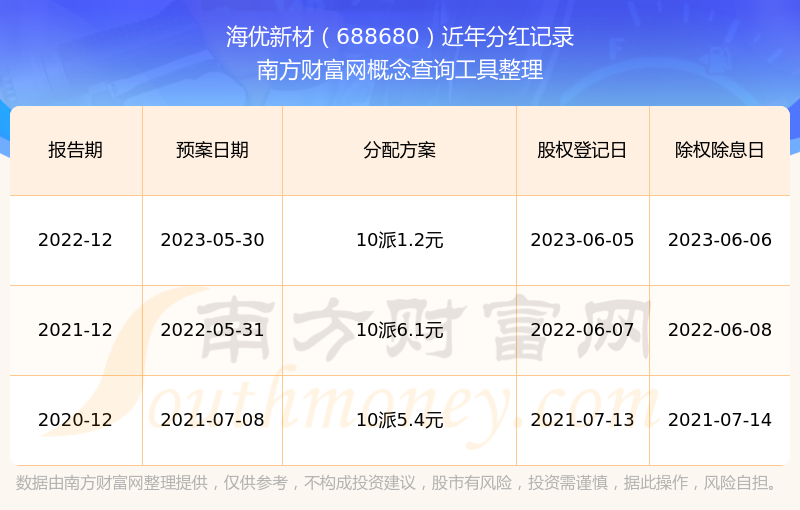 海優(yōu)新材最新一次公布的分紅方案為10派1.2元。本次權(quán)益分派股權(quán)登記日為2023年6月5日,除權(quán)除息日為2023年6月6日,派息日為2023年6月6日。