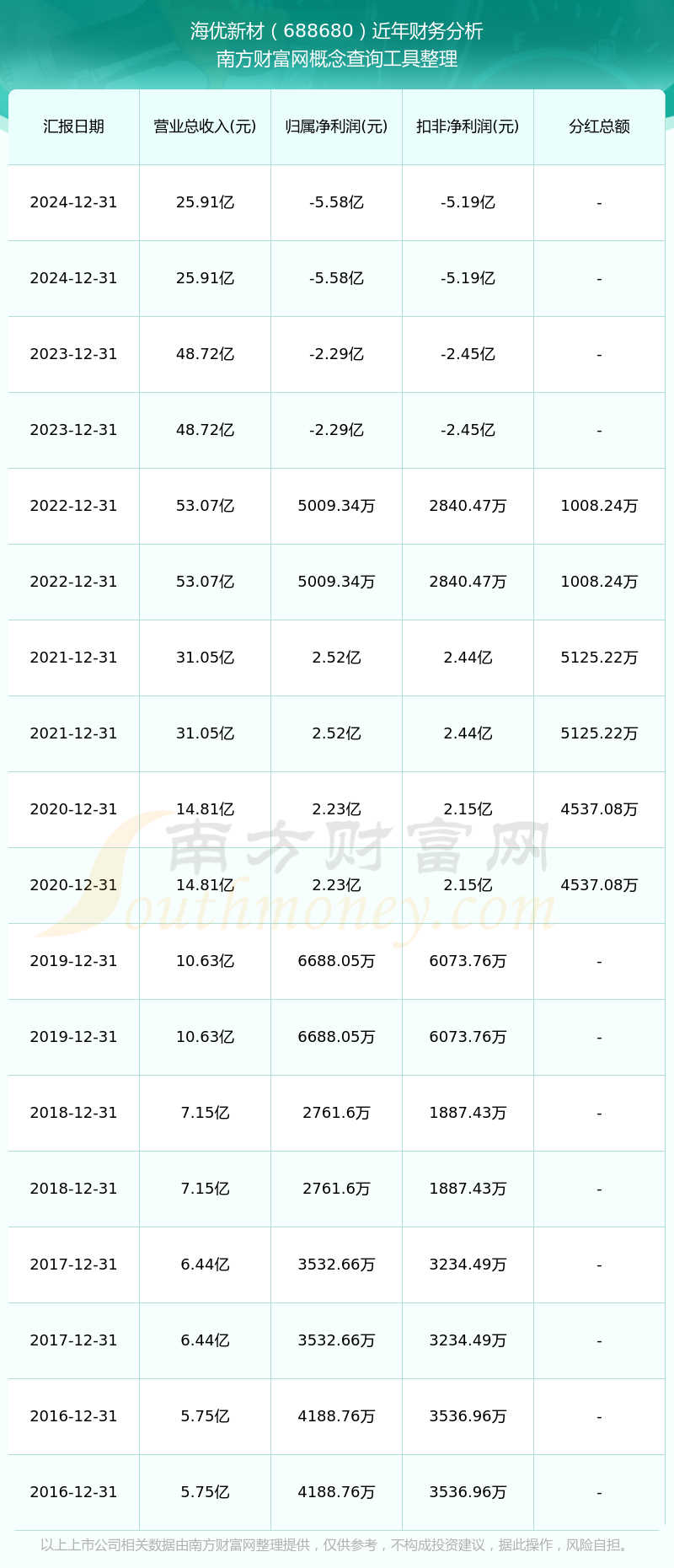 2024年報顯示,海優(yōu)新材實(shí)現(xiàn)營收25.91億,同比增長-46.81%;凈利潤-5.58億,同比增長-144.31%;毛利率-0.44%。