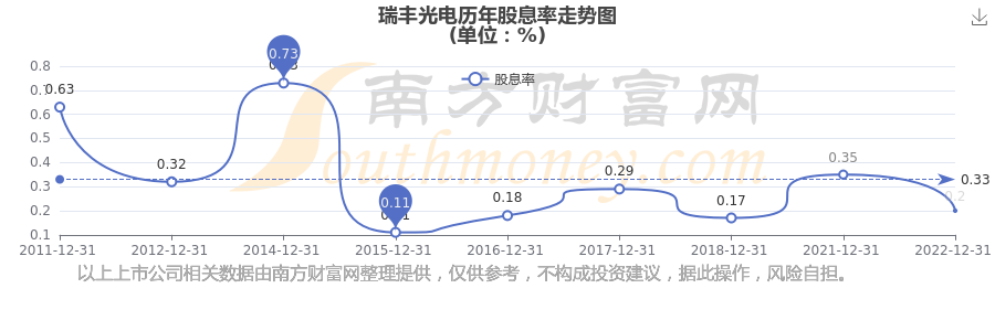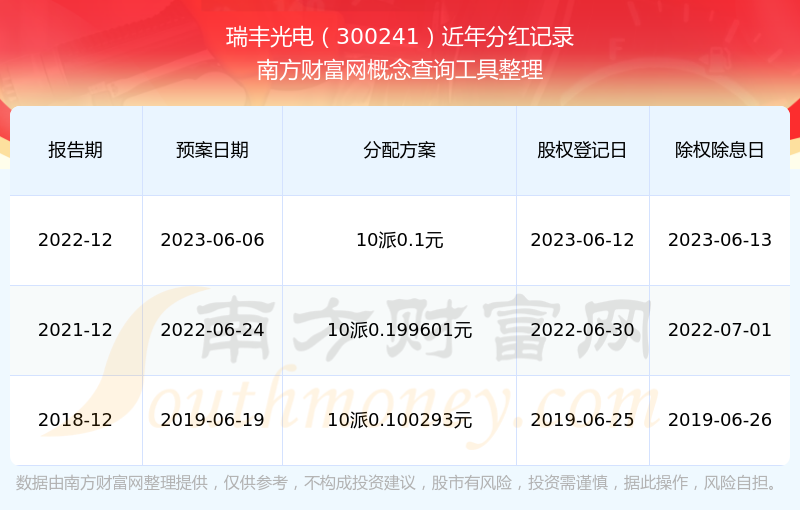 瑞豐光電最新一次公布的分紅方案為10派0.1元。本次權(quán)益分派股權(quán)登記日為2023年6月12日,除權(quán)除息日為2023年6月13日,派息日為2023年6月13日。