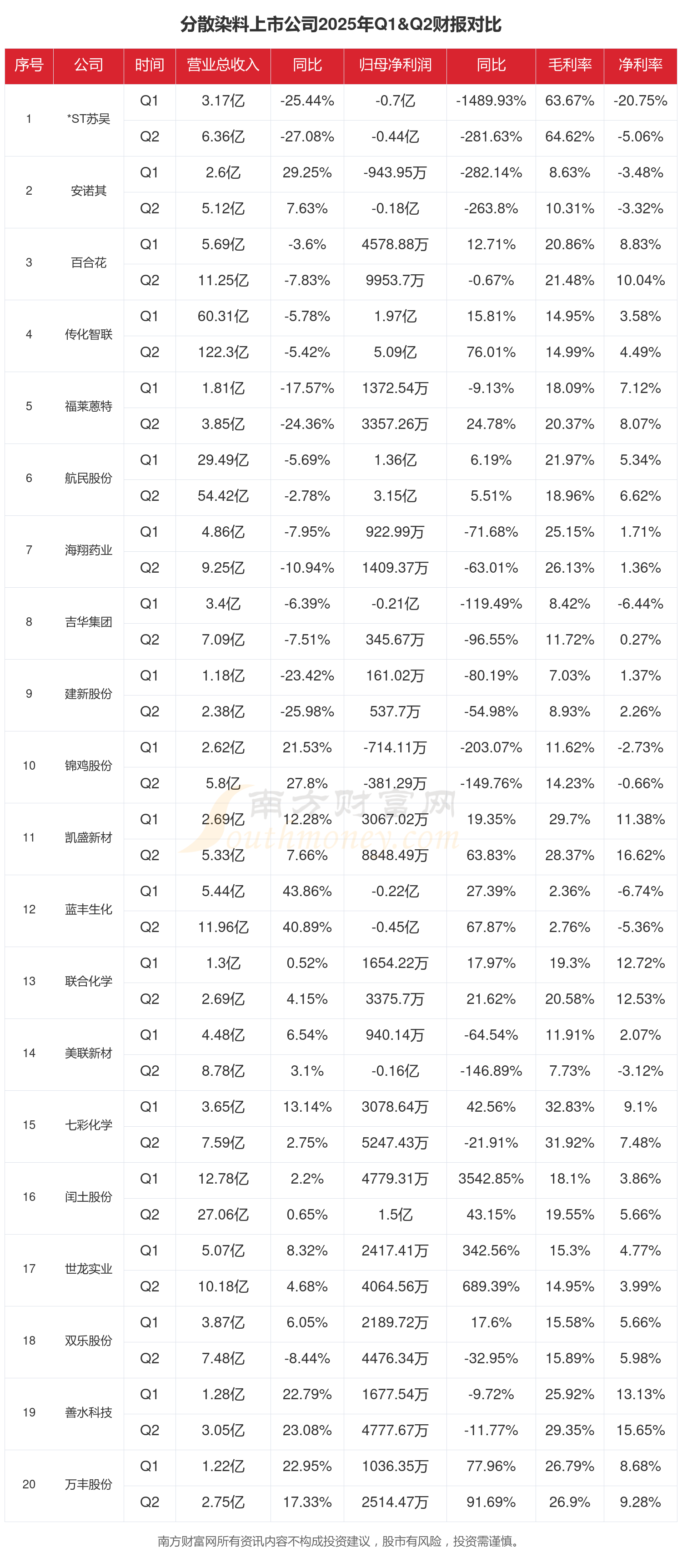 七彩化學(xué)(300758):2025年第二季度季報顯示,七彩化學(xué)公司營業(yè)總收入同比增長-5.3%至3.94億元;凈利潤為2168.79萬,同比增長-52.45%,毛利潤為1.22億,毛利率31.07%。