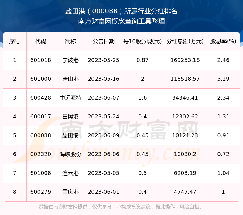 按照南方財(cái)富網(wǎng)趨勢(shì)選股系統(tǒng)統(tǒng)計(jì),鹽田港所屬行業(yè)為航運(yùn)港口行業(yè),航運(yùn)港口行業(yè)分紅排名情況如下表: