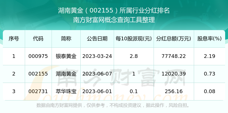 按照南方財富網(wǎng)趨勢選股系統(tǒng)統(tǒng)計,湖南黃金所屬行業(yè)為黃金行業(yè),黃金行業(yè)分紅排名情況如下表: