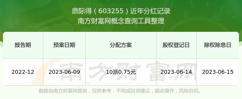 鼎際得最新一次公布的分紅方案為10派0.75元。本次權益分派股權登記日為2023年6月14日,除權除息日為2023年6月15日,派息日為2023年6月15日。
