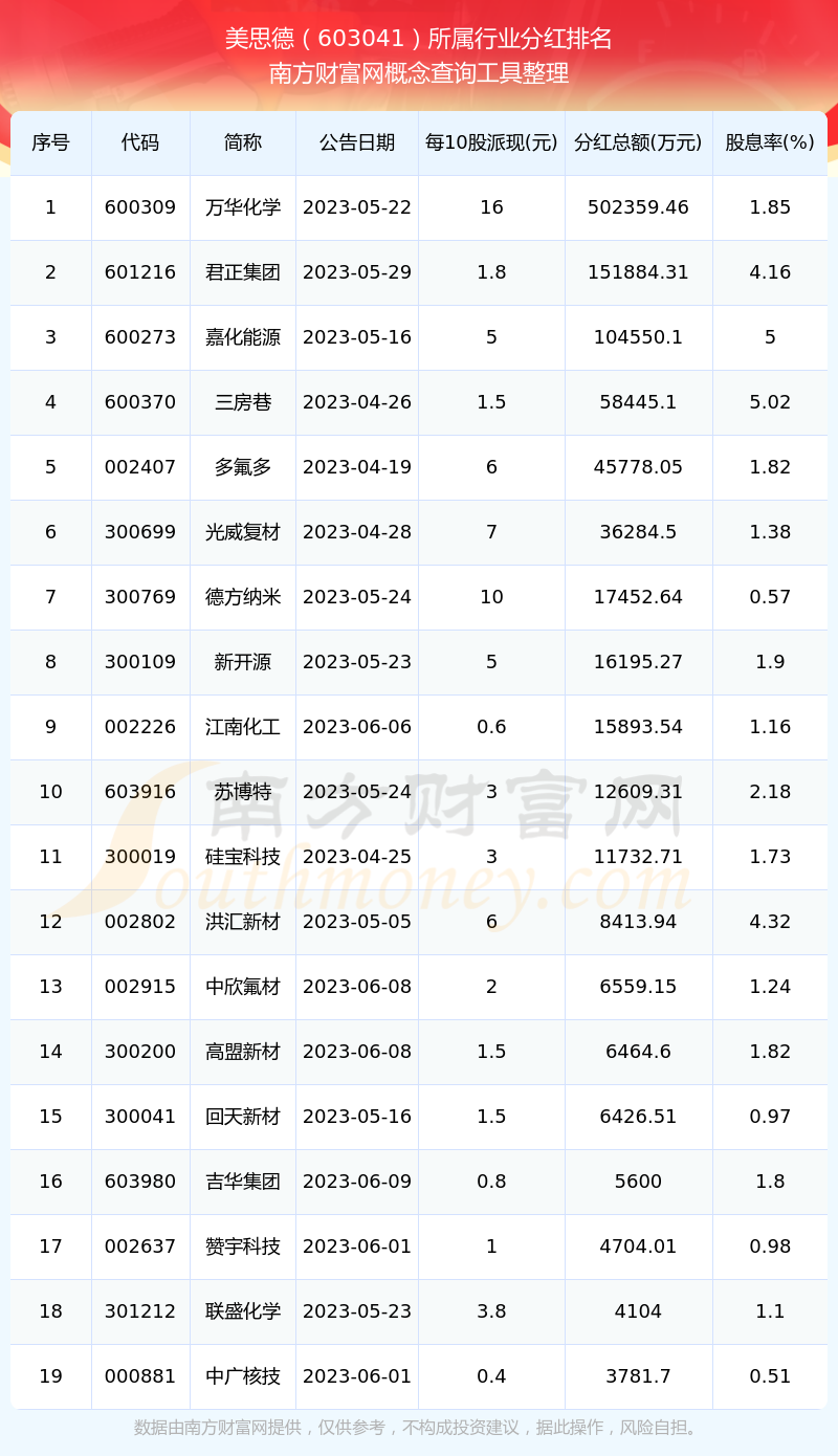 按照南方財(cái)富網(wǎng)趨勢(shì)選股系統(tǒng)統(tǒng)計(jì),美思德所屬行業(yè)為化學(xué)制品行業(yè),化學(xué)制品行業(yè)分紅排名情況如下表: