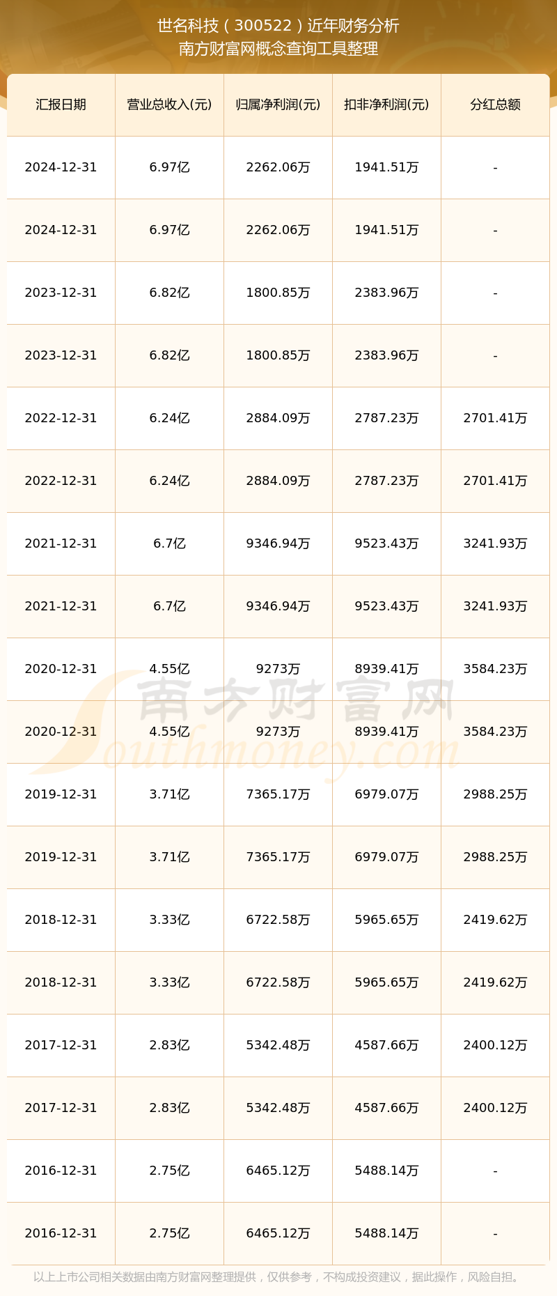 近年世名科技分紅派息情況如下表所示: