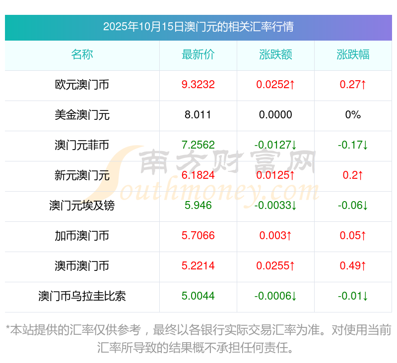 2025年10月15日澳門元相關匯率查詢