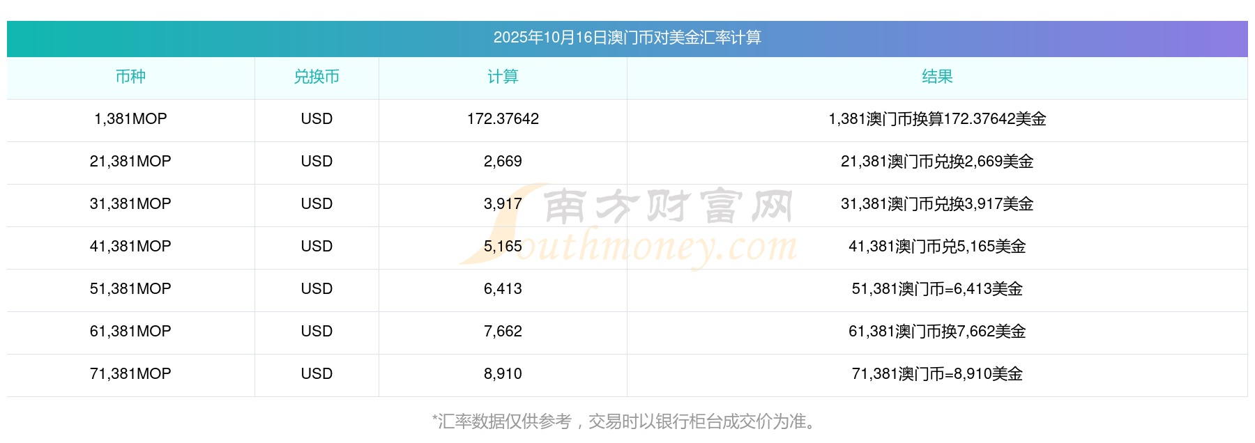 2025年10月16日匯率行情:38澳門幣對美金匯率多少