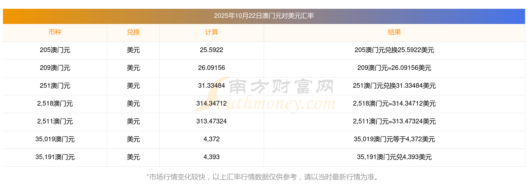 2025年10月22日匯率行情:50澳門元對美元匯率多少