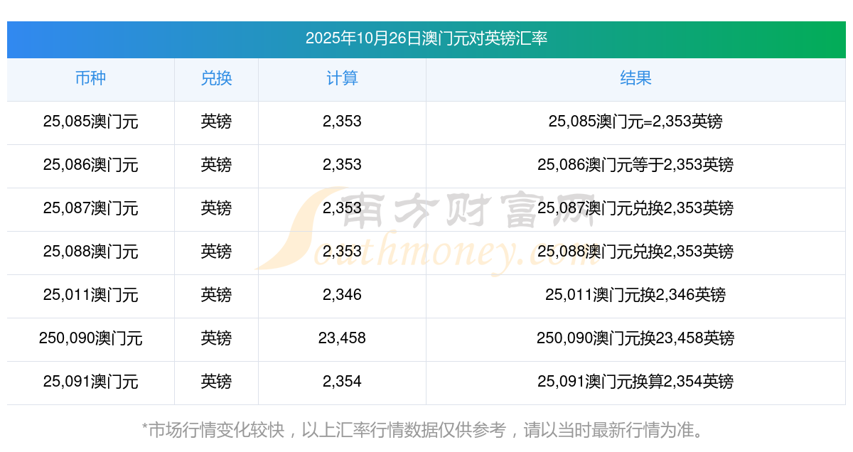 2025年10月26日匯率更新!今天86澳門元兌換英鎊是多少?