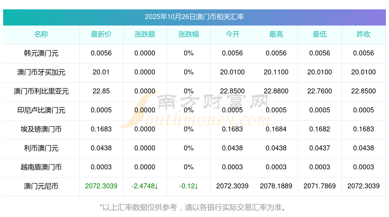 2025年10月26日澳門(mén)幣相關(guān)匯率查詢(xún)