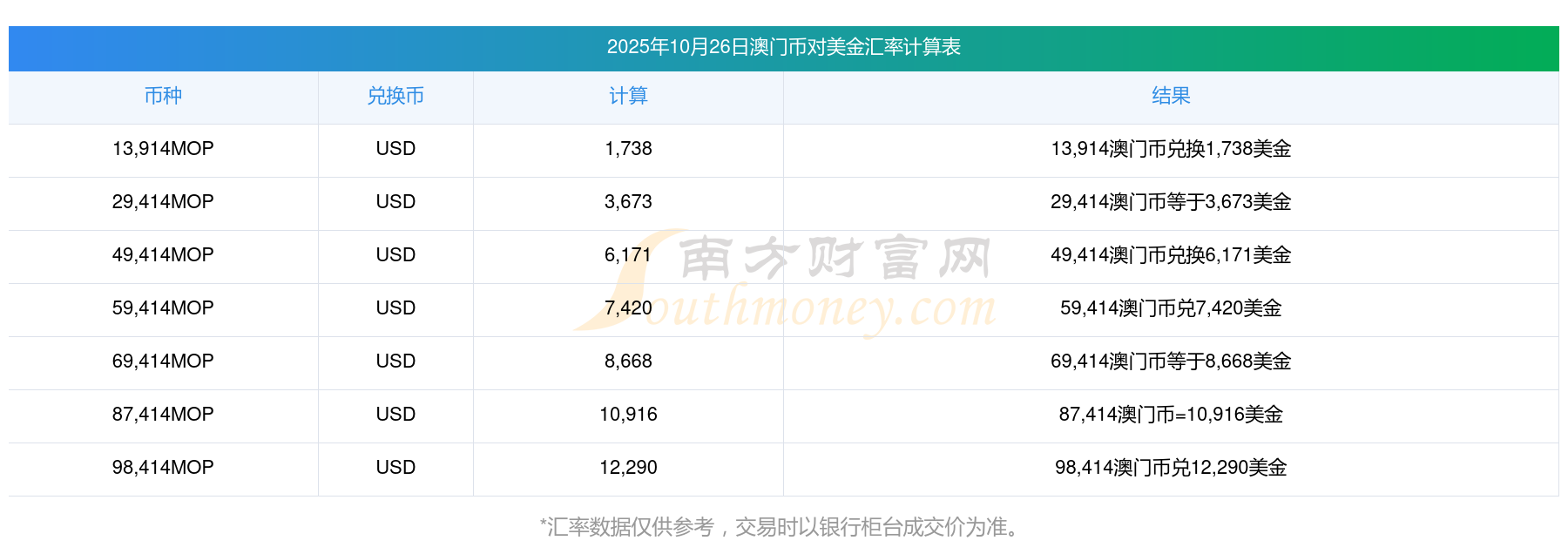 2025年10月26日匯率行情:19澳門幣對美金匯率多少