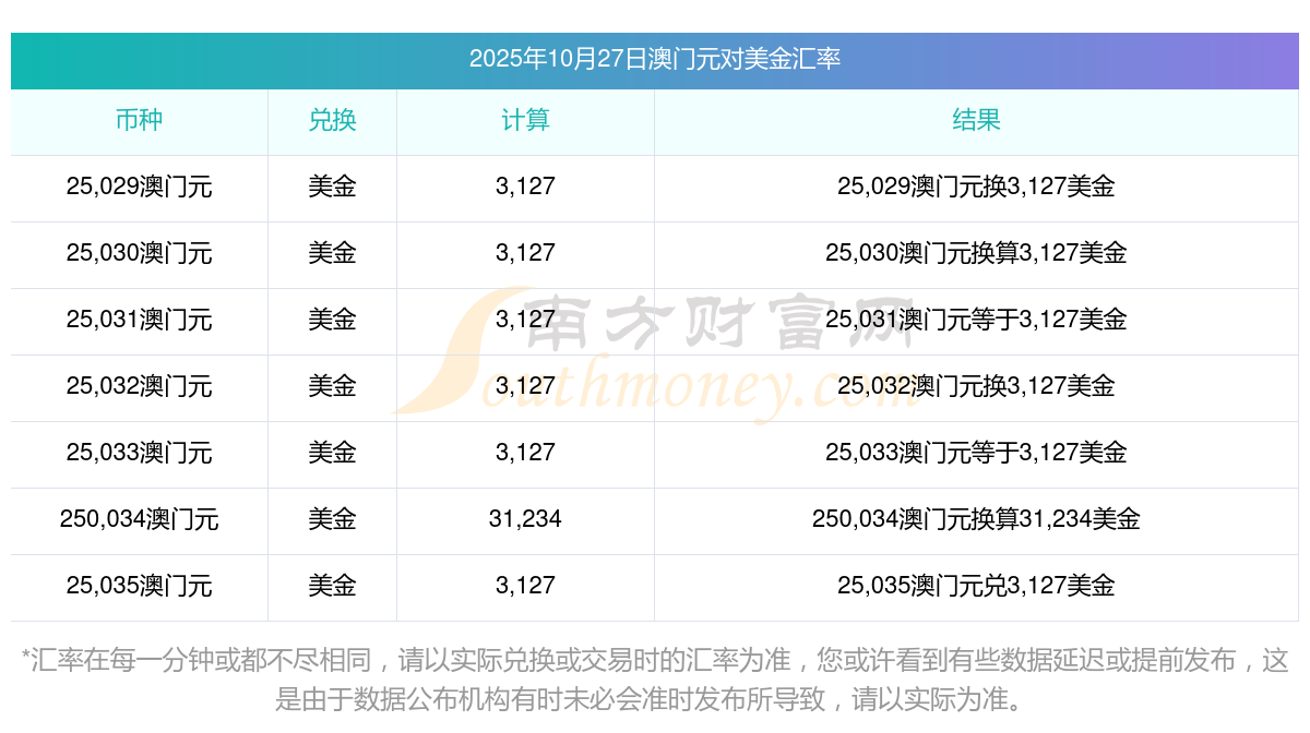 2025年10月27日匯率行情:41澳門元對美金匯率多少