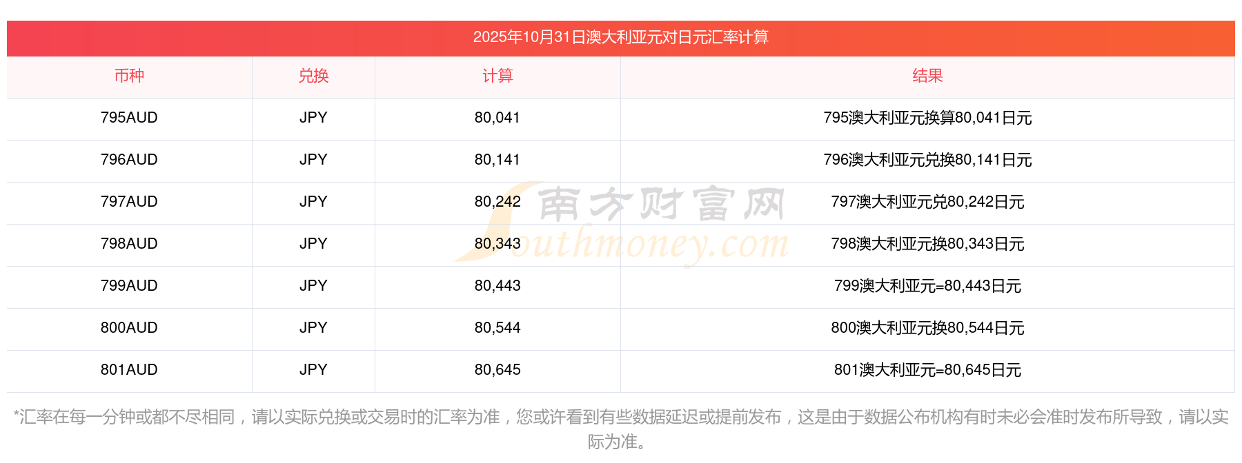 匯率在每一分鐘或都不盡相同,請以實際兌換或交易時的匯率為準,您或許看到有些數(shù)據(jù)延遲或提前發(fā)布,這是由于數(shù)據(jù)公布機構(gòu)有時未必會準時發(fā)布所導致,請以實際為準。