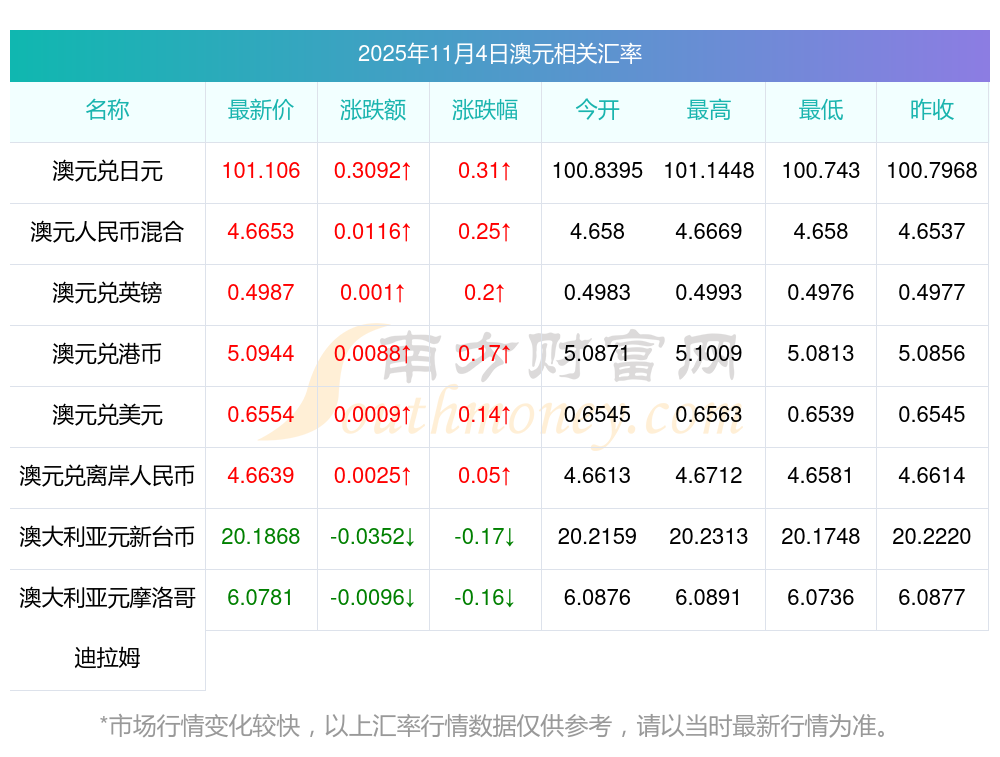 2025年11月4日澳元相關(guān)匯率查詢