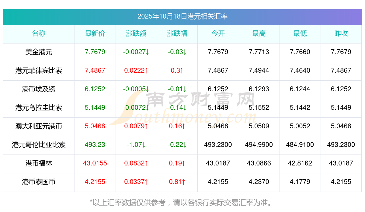 2025年10月18日港元兌換蘭幣最新匯率:2.235900,今開:2.2359,昨收:2.2359,最高:2.2519,最低:2.2285。