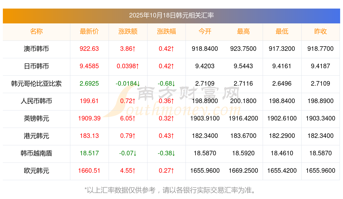 2025年10月18日韓元相關(guān)匯率查詢