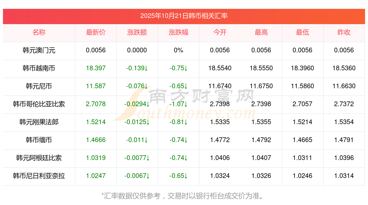 根據(jù)2025年10月21日匯率,韓幣兌換盧布匯率最新0.056834,今開0.0569,昨收0.0569,最高0.0569,最低0.0564。