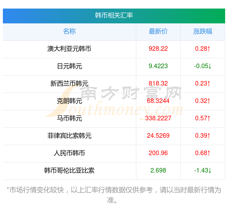 南方財(cái)富網(wǎng)為您提供韓幣對(duì)新臺(tái)幣匯率最新價(jià)格詳情。