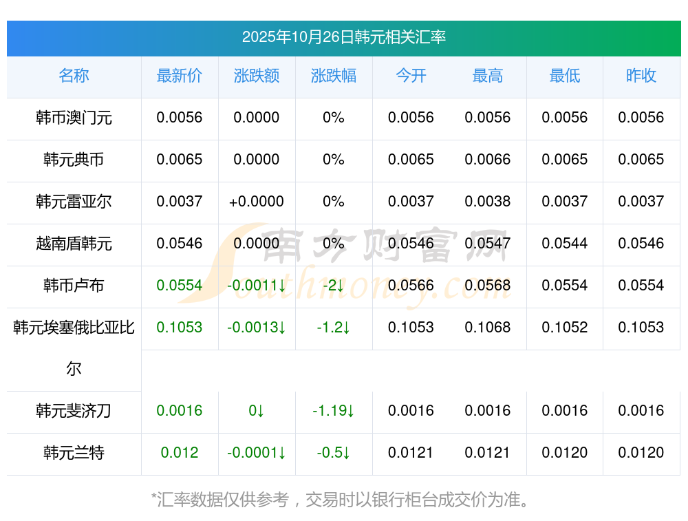 根據(jù)2025年10月26日匯率計算,KRW兌換USD匯率最新價0.000695:今日開價0.0007,昨日收價0.0007,最高價0.0007,最低價0.0007。