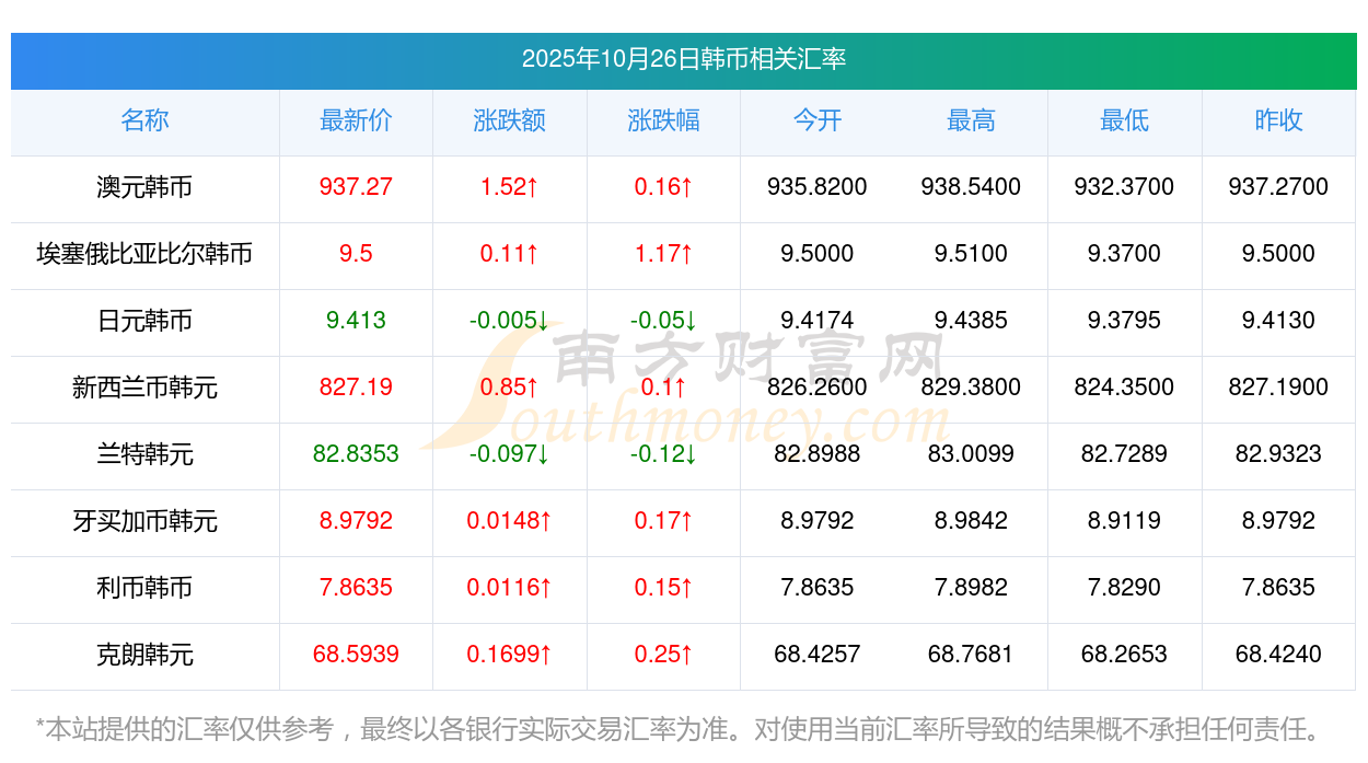 2025年10月26日韓幣相關(guān)匯率查詢(xún)