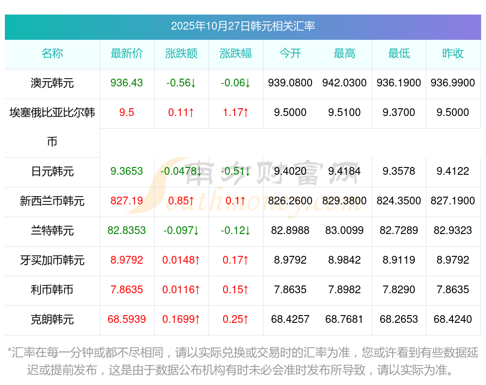 根據(jù)2025年10月27日匯率,韓元兌換比索匯率最新價1.041907,今開價1.0367,昨收價1.0367,最高價1.0421,最低價1.0367。