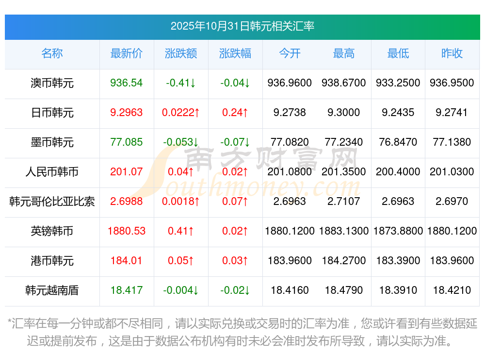 根據(jù)2025年10月31日匯率,韓元兌換英鎊匯率最新價0.000532,今開價0.0005,昨收價0.0005,最高價0.0005,最低價0.0005。