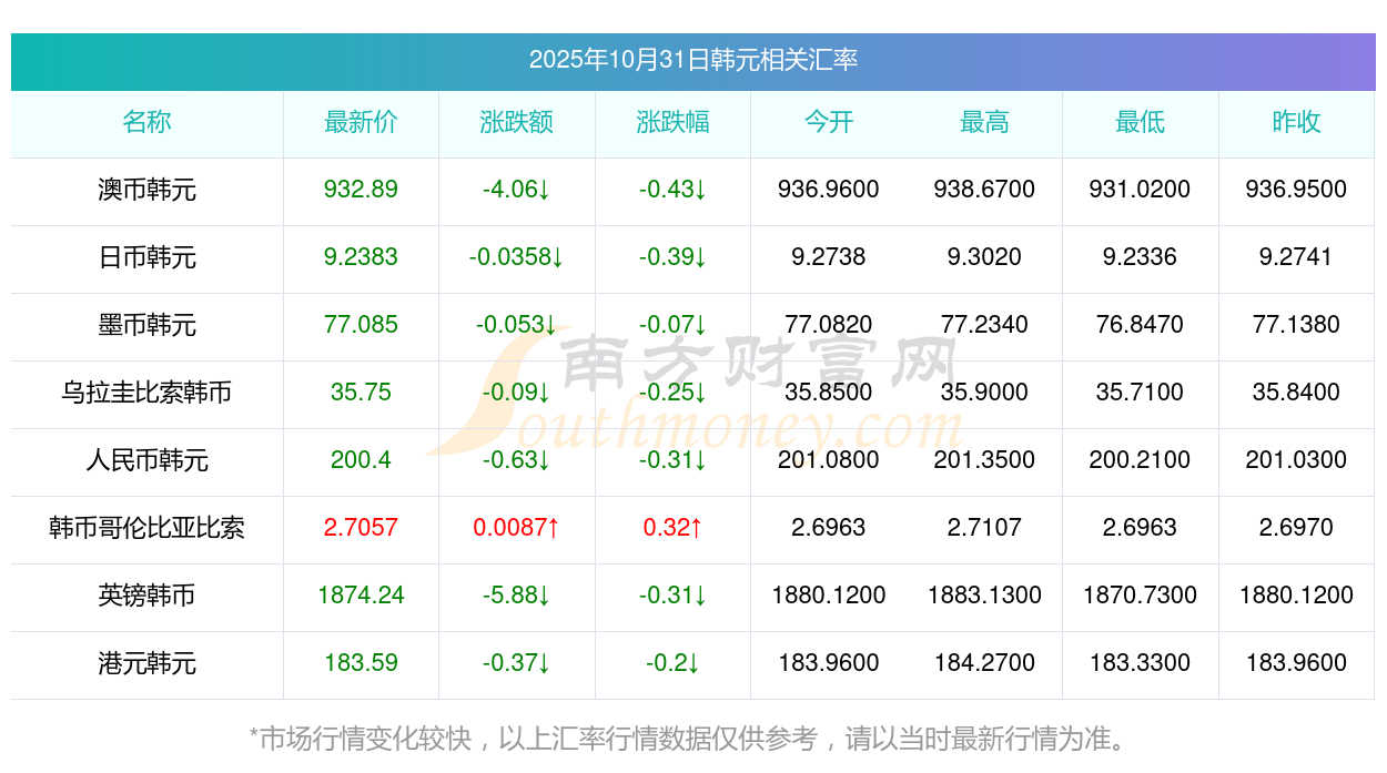 根據(jù)2025年10月31日匯率計(jì)算,韓元兌換智利比索匯率最新價(jià)0.660442,今開價(jià)0.6596,昨收價(jià)0.6596,最高價(jià)0.6618,最低價(jià)0.6585。