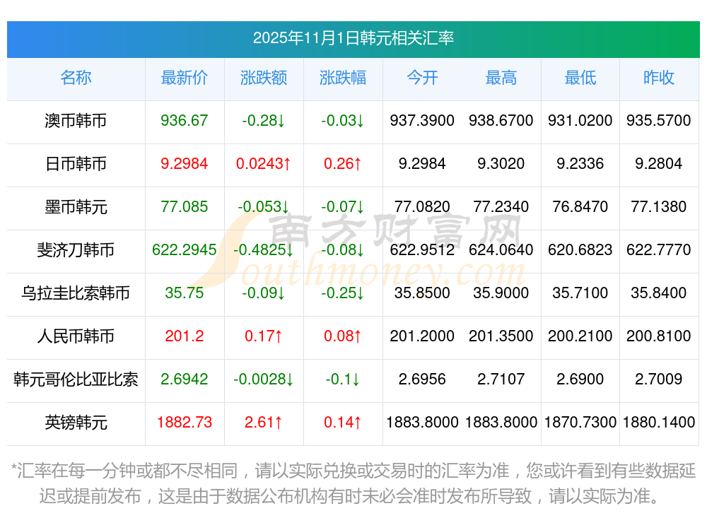 2025年11月1日韓元相關(guān)匯率查詢(xún)