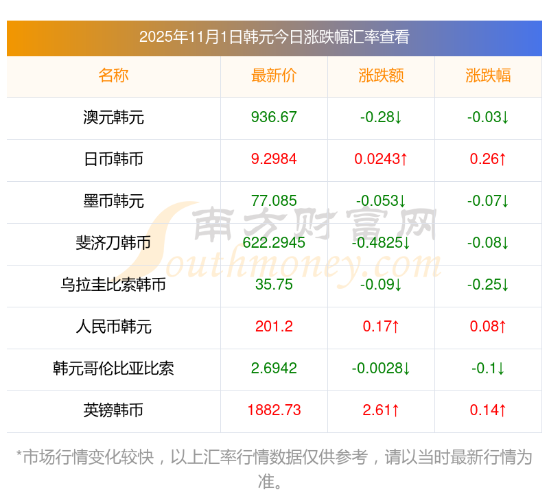 根據(jù)2025年11月1日匯率計(jì)算,韓元兌換埃及鎊匯率最新價(jià)0.032989,今開(kāi)價(jià)0.0330,昨收價(jià)0.0331,最高價(jià)0.0332,最低價(jià)0.0330。