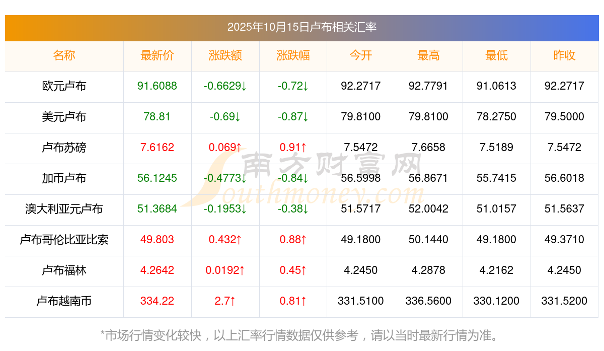 南方財(cái)富網(wǎng)為您提供盧布對(duì)人民幣匯率最新價(jià)格詳情。