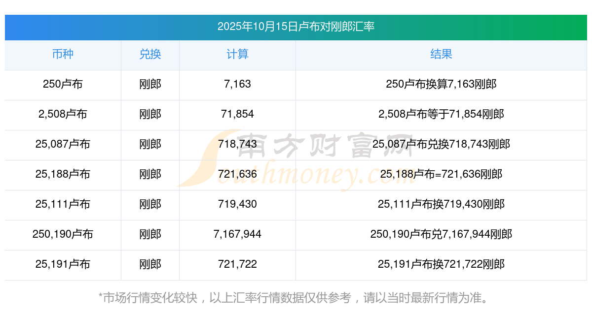 南方財(cái)富網(wǎng)為您提供盧布對(duì)剛郎匯率最新價(jià)格詳情。