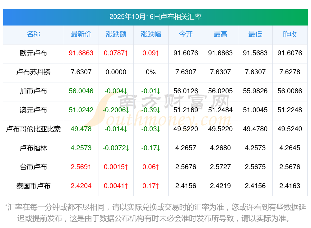 根據(jù)2025年10月16日匯率計算,RUB兌換MAD匯率最新價0.116700:今開價0.1168,昨收價0.1168,最高價0.1168,最低價0.1165。